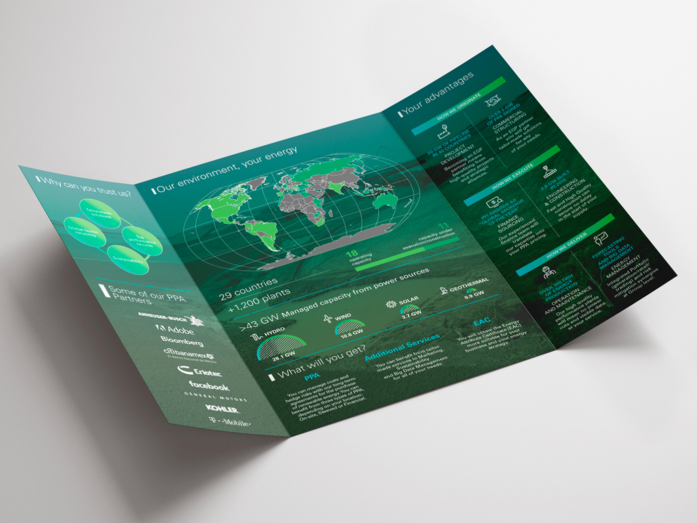 Enel Green Power, the global leader in renewable energies, needed to restyle its commercial BTL materials to convey its sustainability message up to modern standards. The aim was to give the materials a fresher look while making their leading selling points clearer to customers.