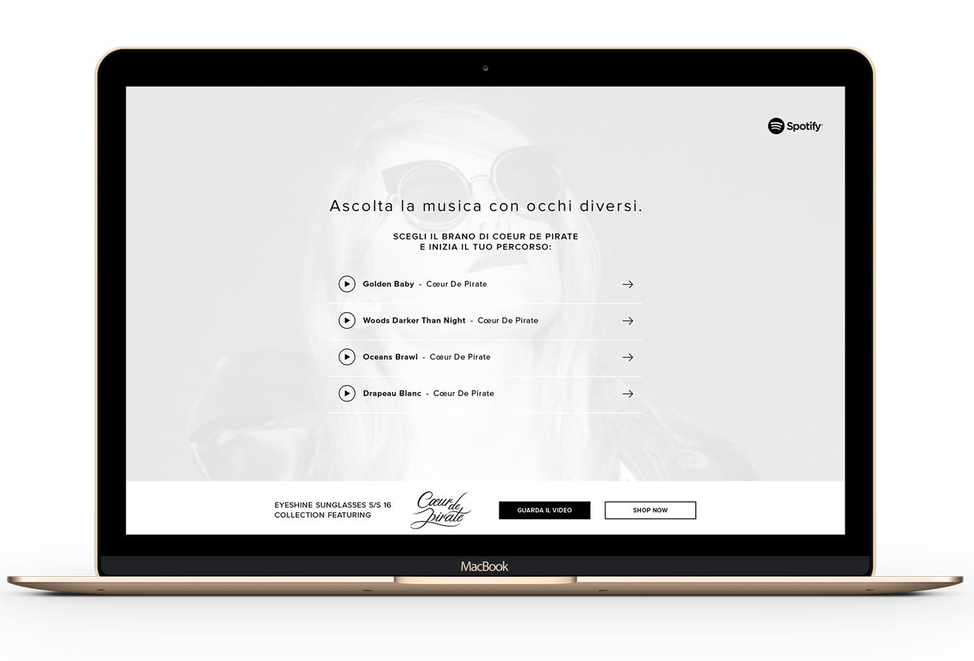 The Experience begins by using one of four Coeur De Pirate’s tracks in homepage as an inspiration. Each tracks corresponds to a mood, one for each EyeShine model: white, dark, gold and acqua. Trough thrilling and amazing storytelling, your gaze will pleasantly