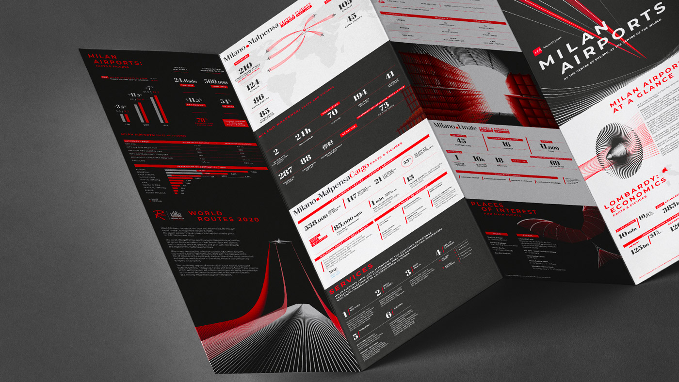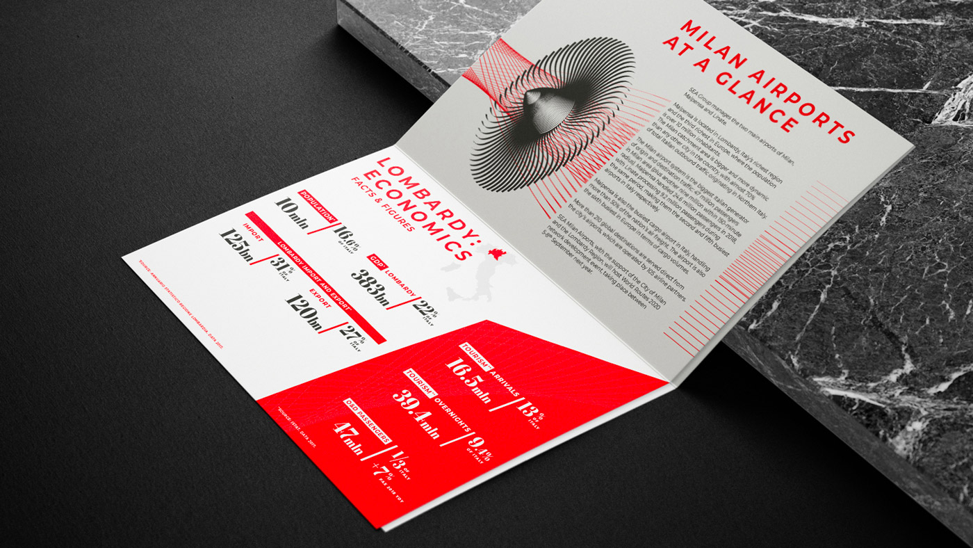 A page is not nearly enough to present them. Therefore, we came up with a brochure that opens out into a large poster on which sophisticated forms, representing the wheels of airplanes, come together to form Milan’s Duomo. It was sent out everywhere, including China.